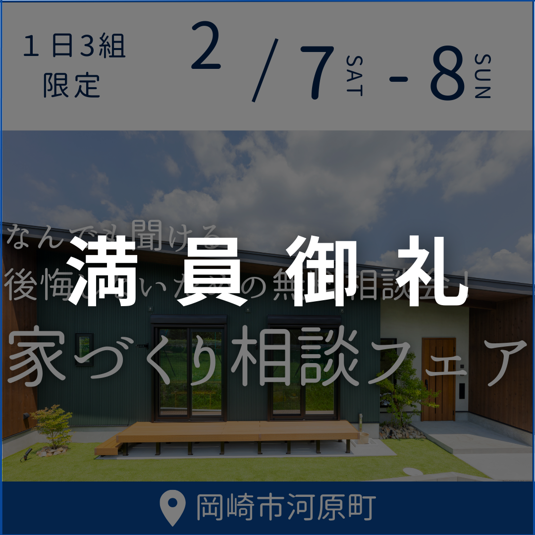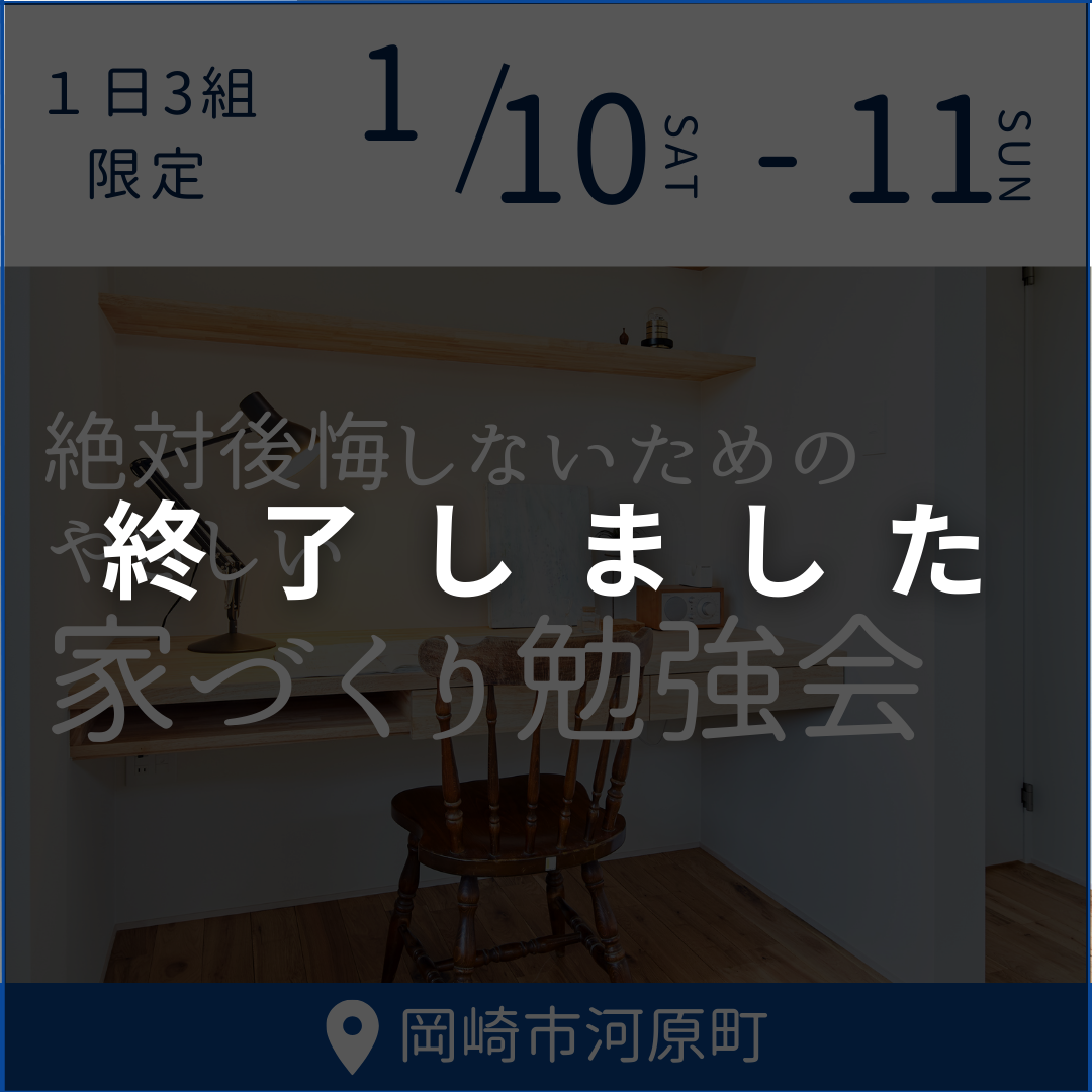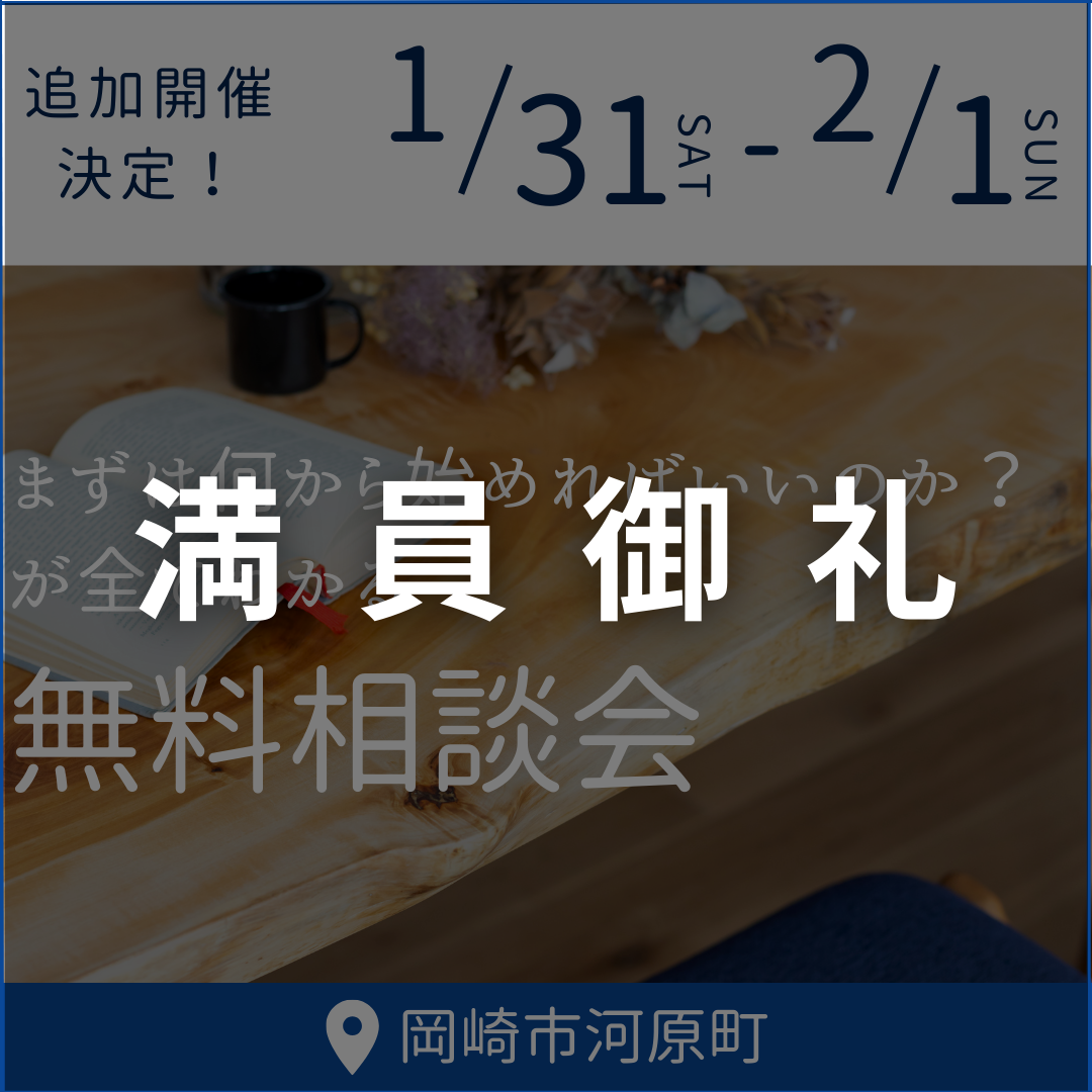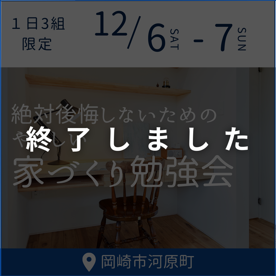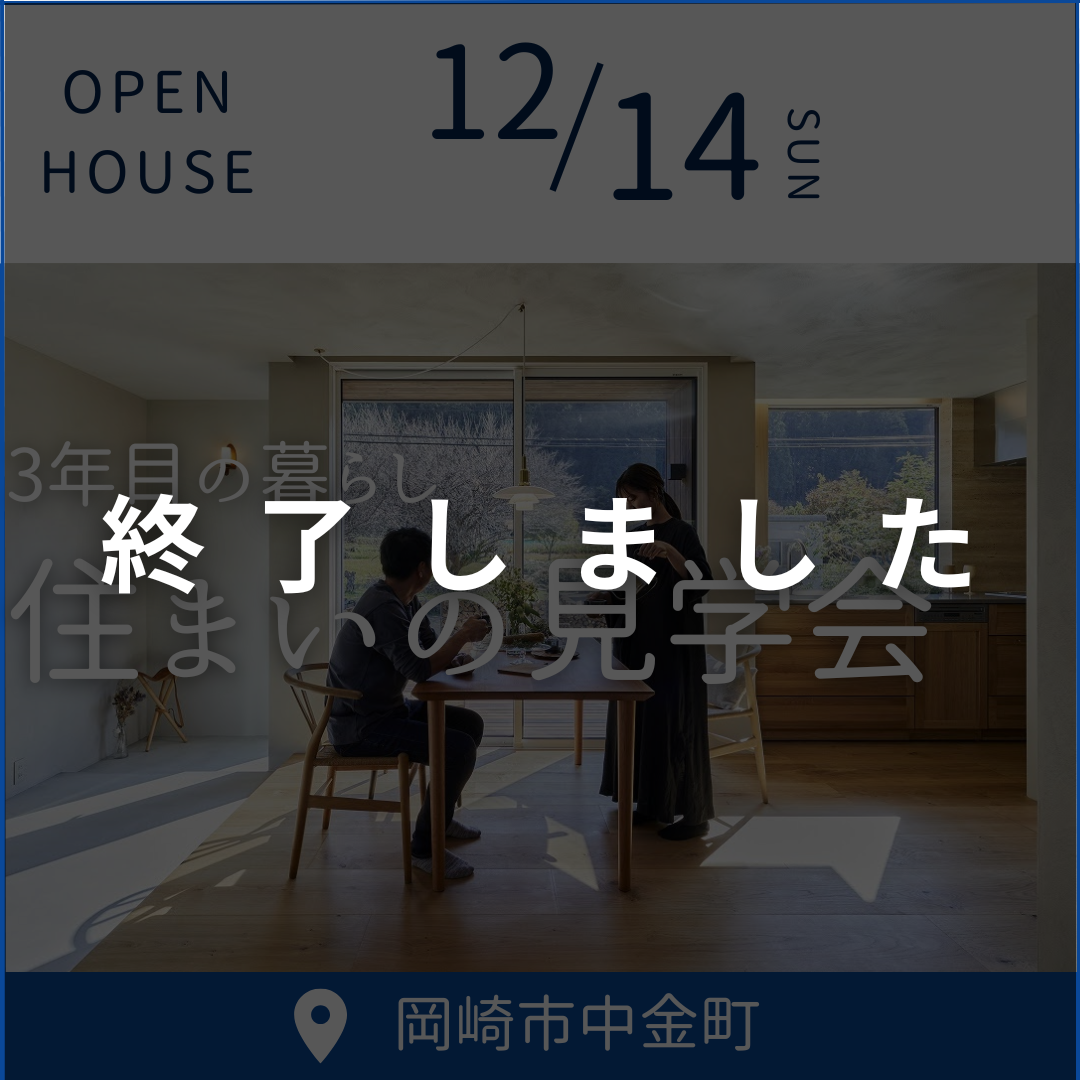 開催日 2025.12/14(日) ※1日限定開催 時間 10:00~17:00 ※各回2組までに限ります 開催場所 岡崎市中金町(詳細住所はご予約の際にお伝えします) 【予約制・先着順】住まいの見学会 12/14(日) […]